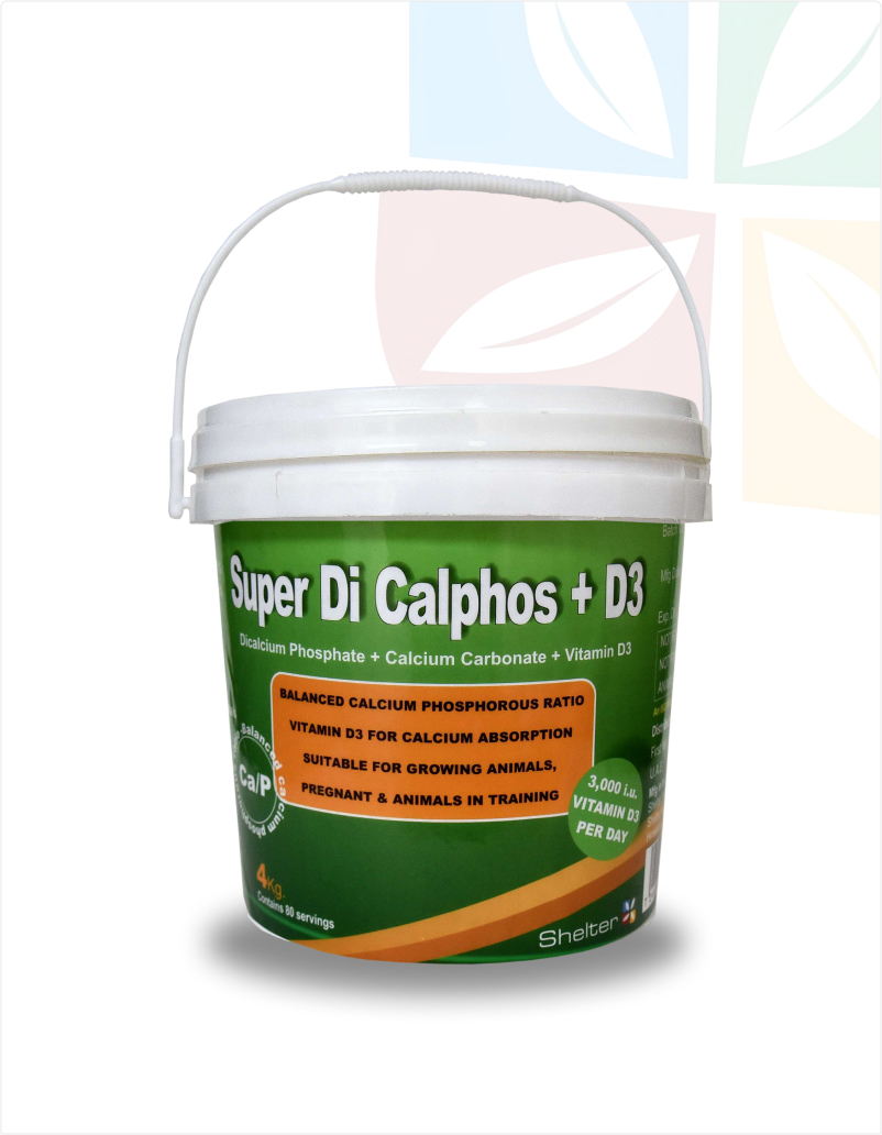 Super Di Calphos + D3 is highly effective for growing animals. It helps stimulate intestinal calcium and phosphate absorption and controls bone mineral metabolism. Additionally, it acts as an anti-stress agent, promotes the formation of strong bones, and improves digestibility.